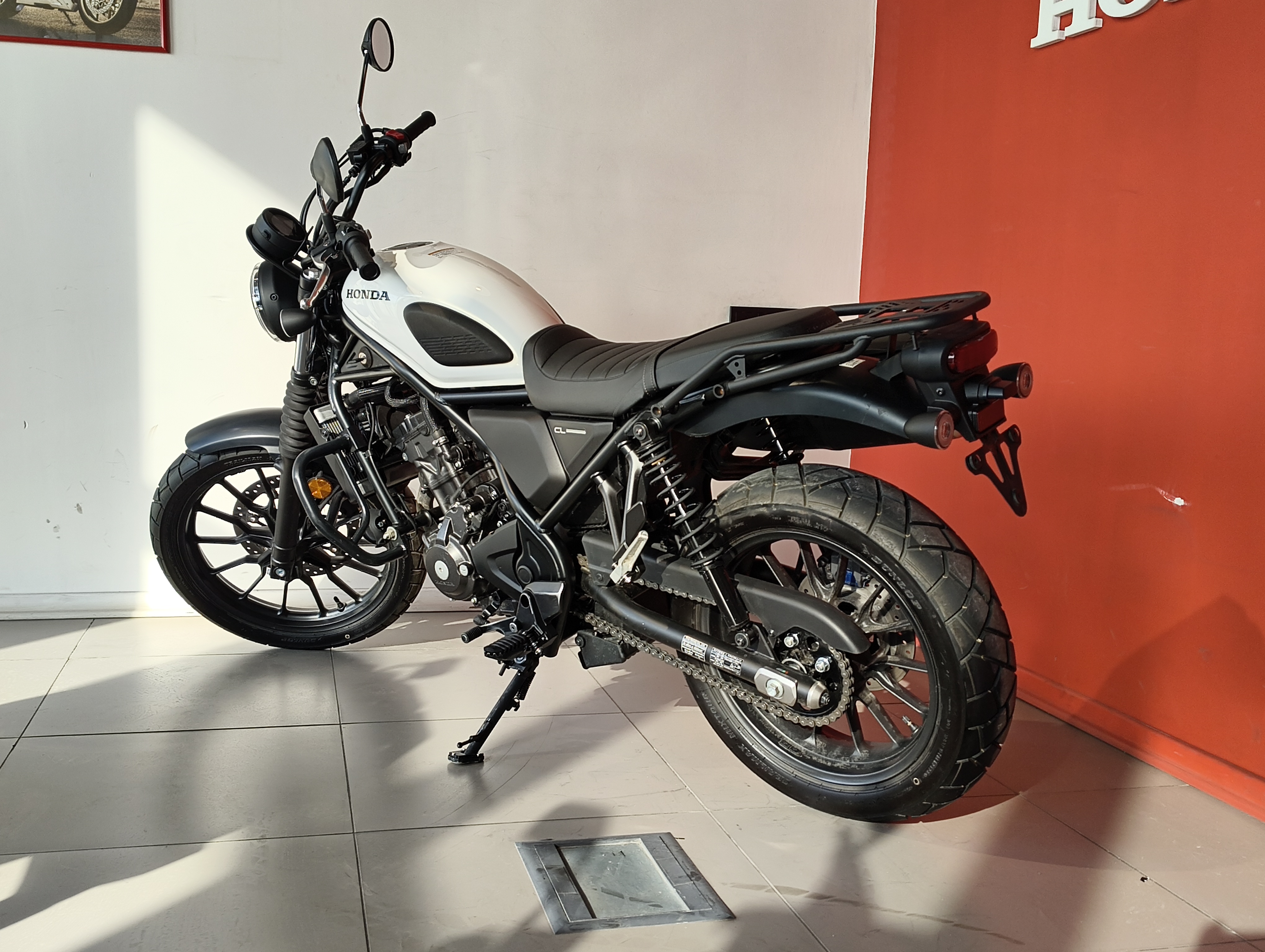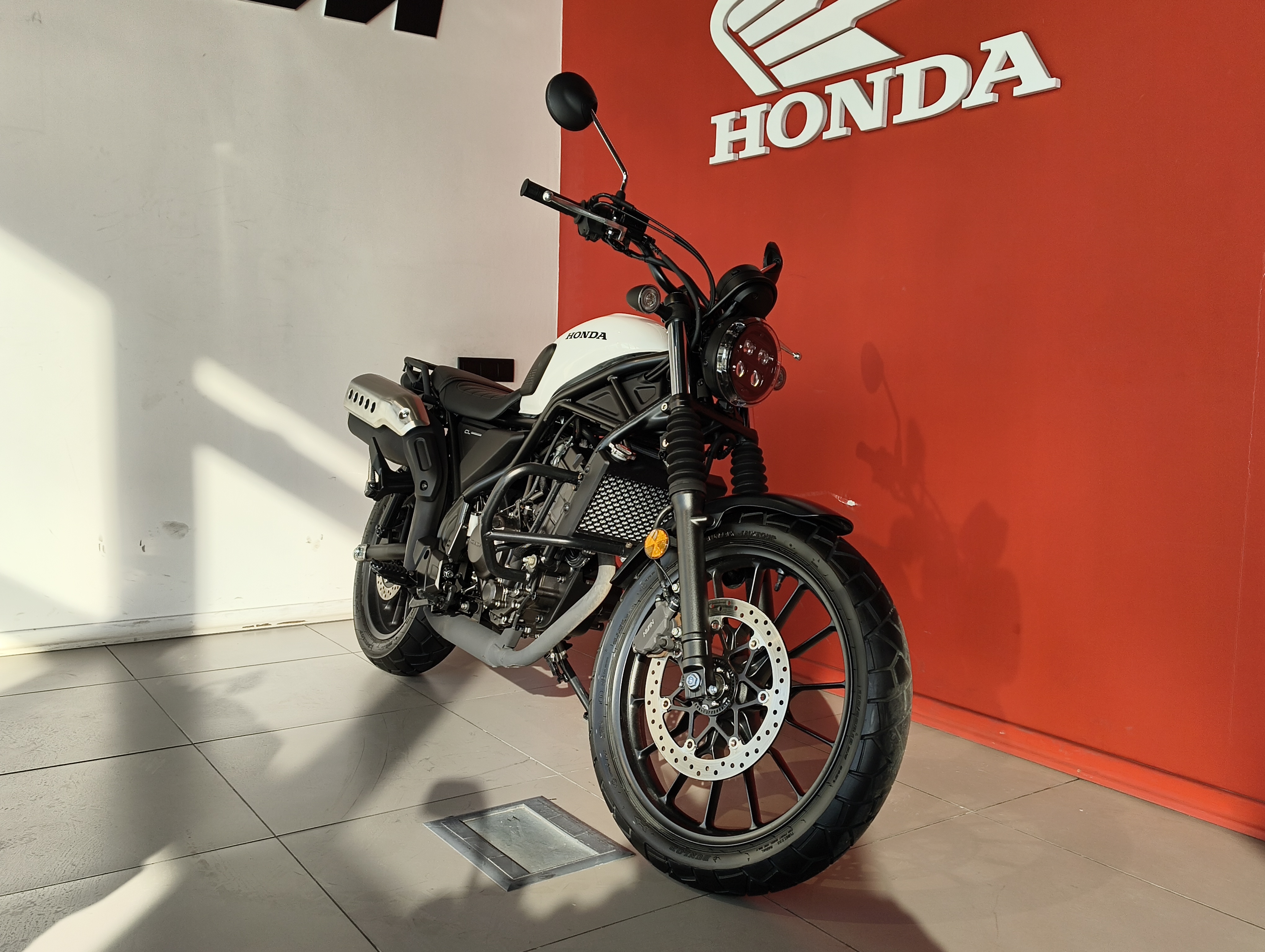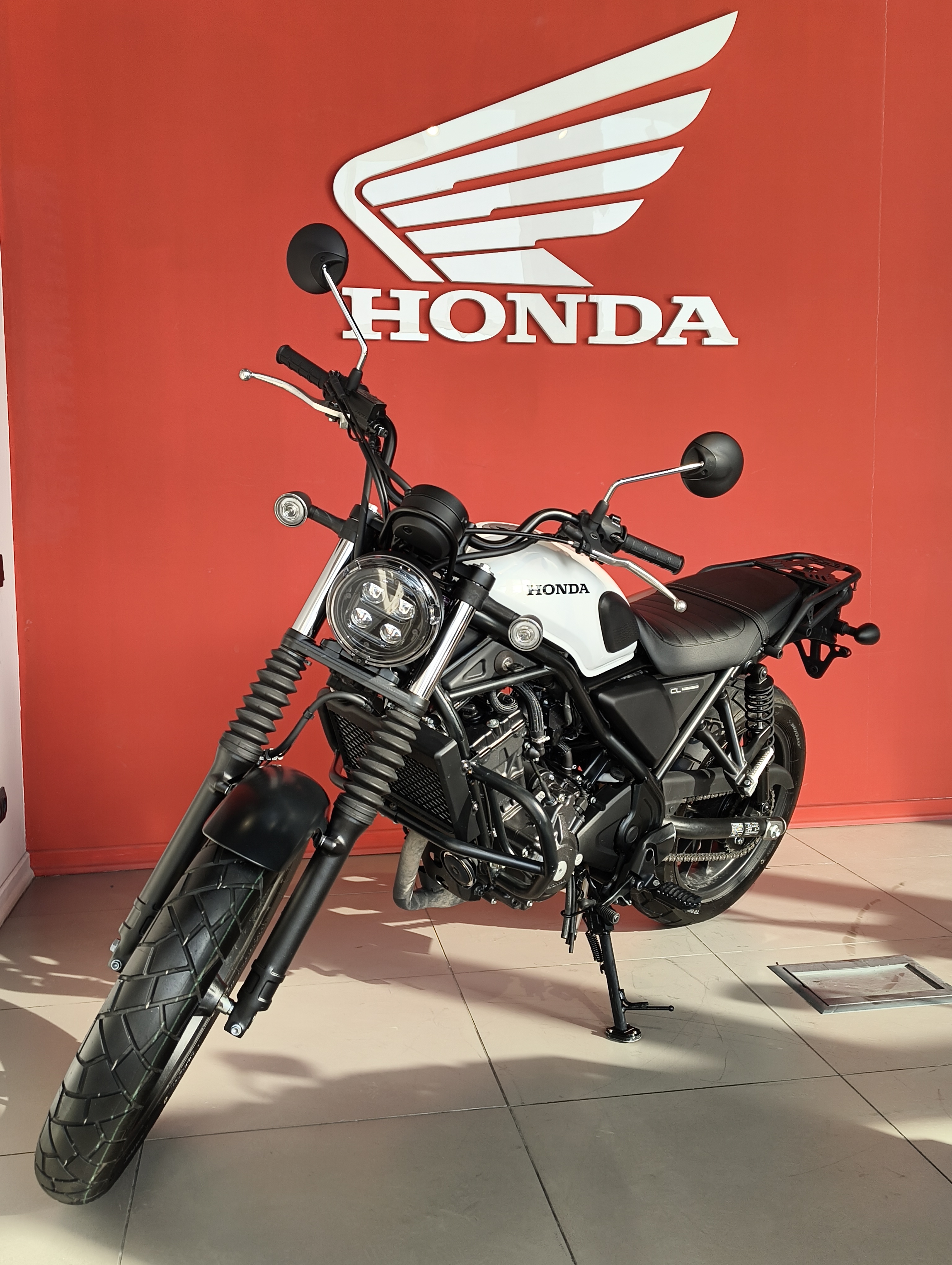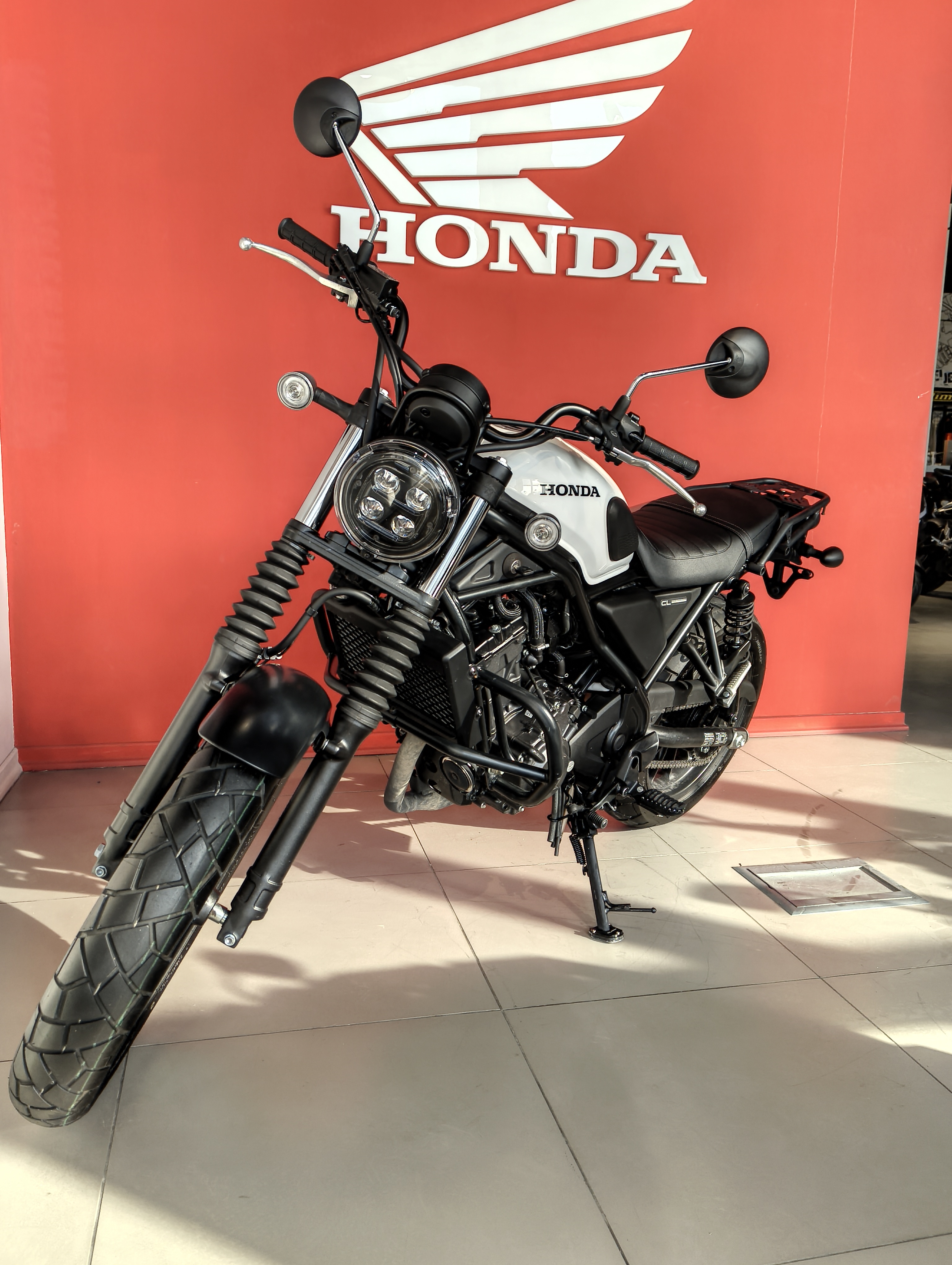 Дизайн: Характерный для скрамблеров высоко расположенный глушитель, гофры на вилке, круглый светодиодный фонарь и плоское сиденье.